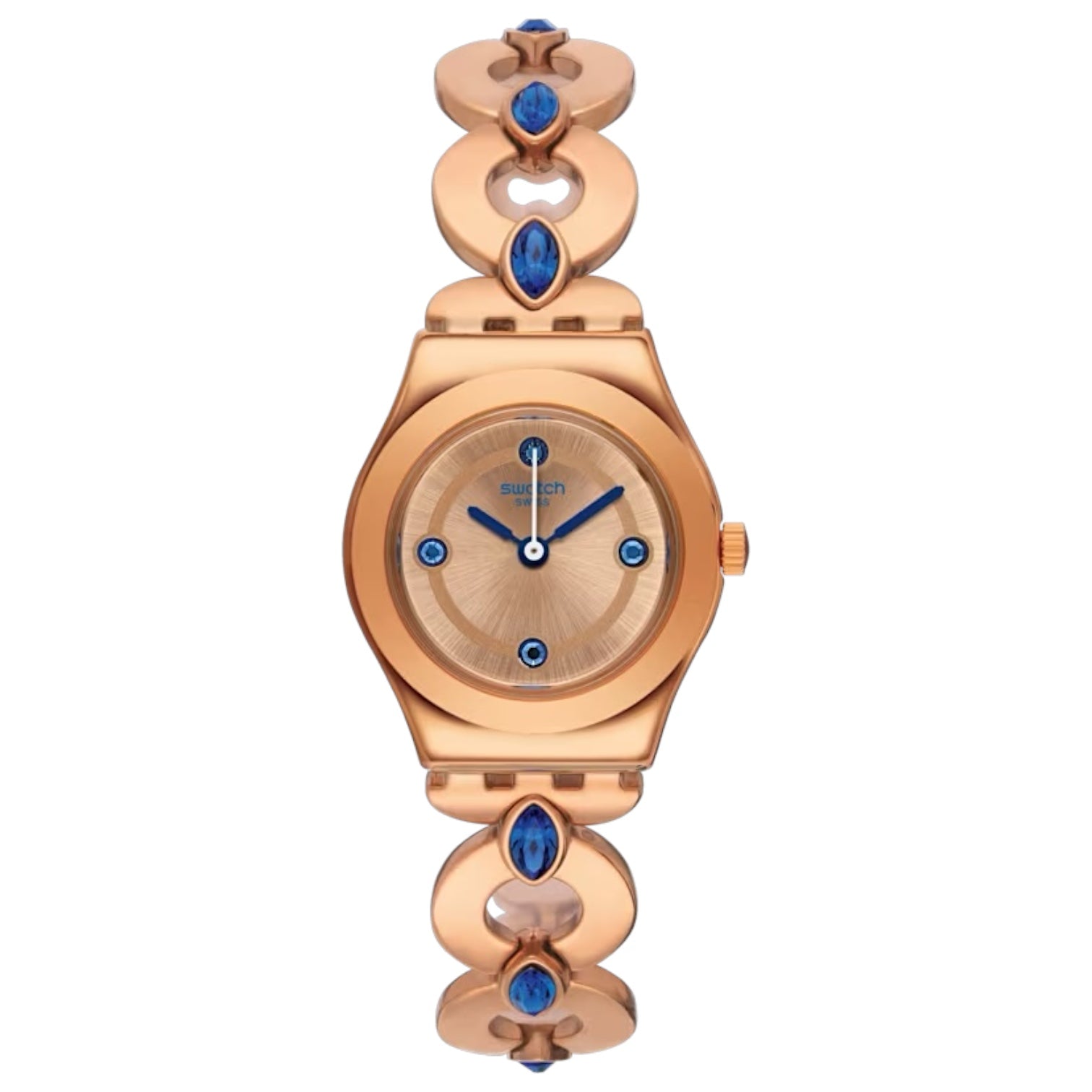 Orologio solo tempo da donna o bambina di Swatch della collezione Irony Mini Goldenlinkings. Cassa in acciaio rosato lucido del diametro di 25 mm, quadrante rosato con cristalli blu, sfere blu, cinturino in acciaio rosato con cristalli blu a bracciale, chiusura di sicurezza in acciaio rosato. Resistenza all'acqua 3 bar. Movimento al quarzo Swiss Made.