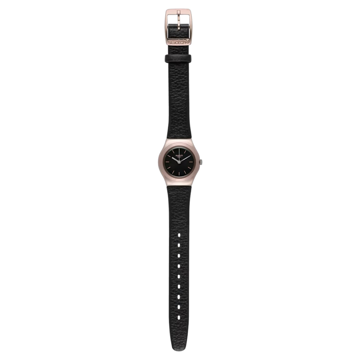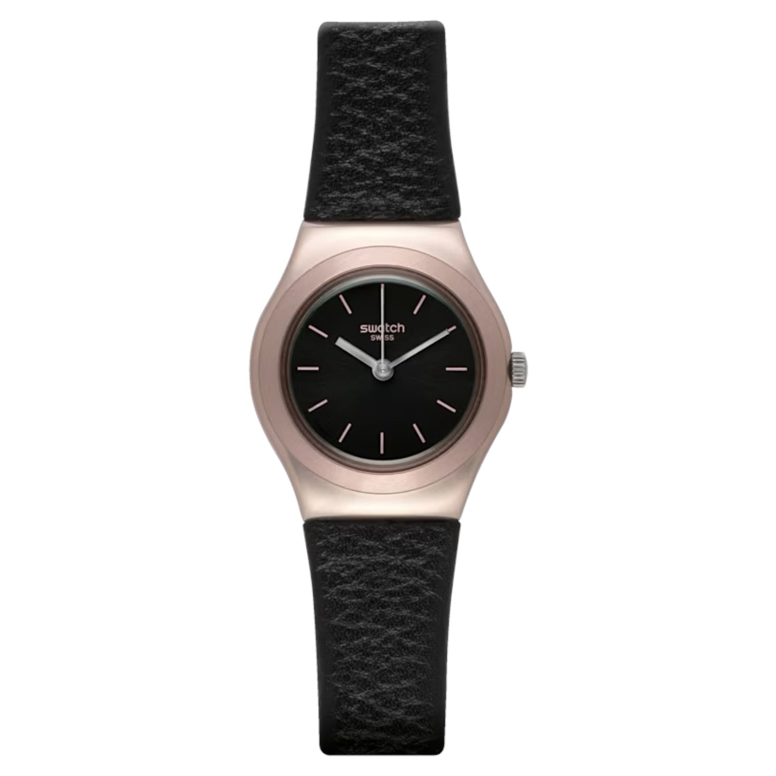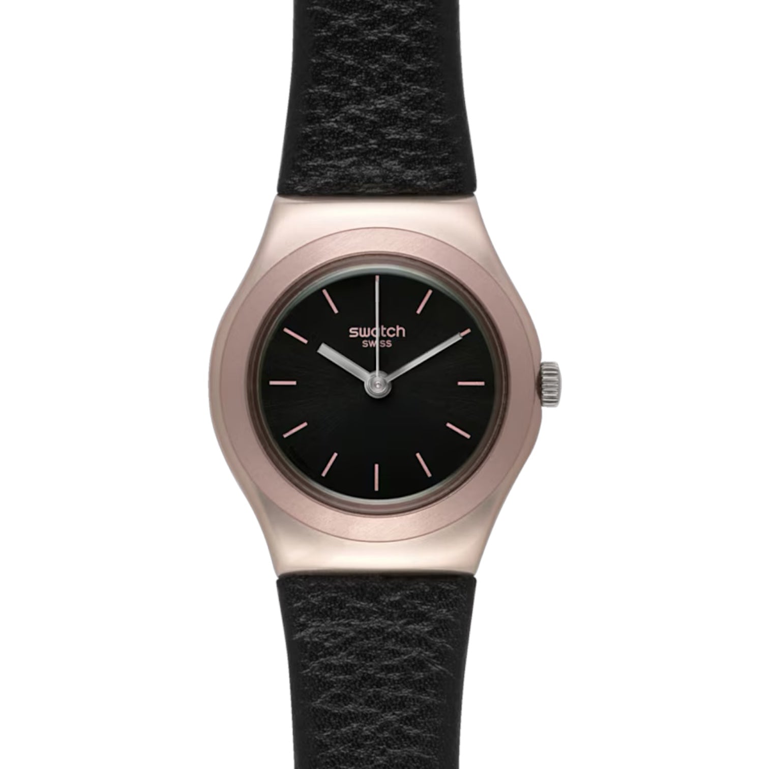 Orologio solo tempo da donna o bambina di Swatch della collezione Irony Mini Nightfall. Cassa in alluminio satinato rosa del diametro di 25 mm, quadrante nero con indici rosa, sfere silver, cinturino in pelle nera, chiusura fibbia in alluminio. Resistenza all'acqua 3 bar. Movimento al quarzo Swiss Made.
