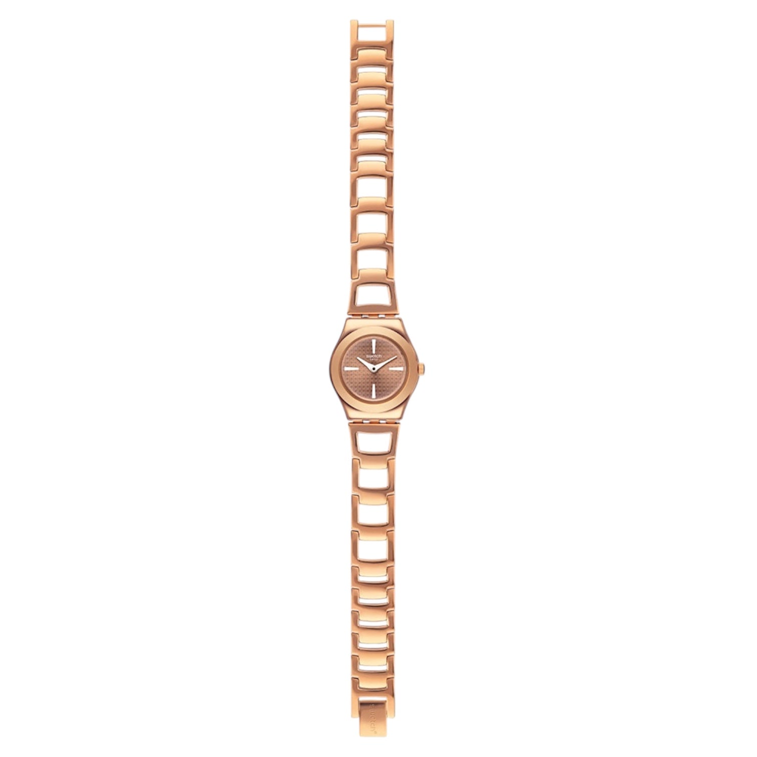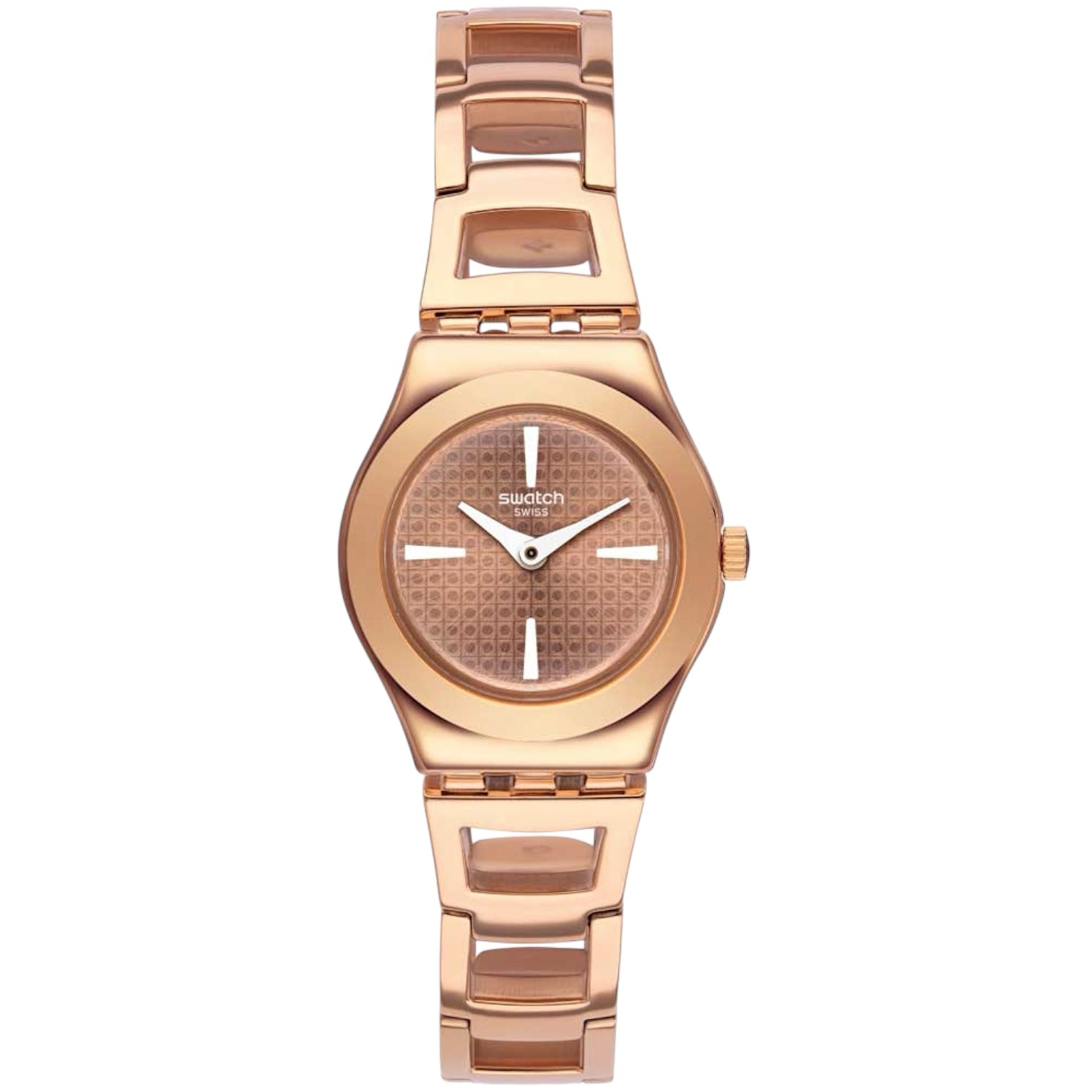 Orologio solo tempo da donna o bambina di Swatch della collezione Irony Mini Roseli. Cassa in acciaio rosato lucido del diametro di 25 mm, quadrante rosato lavorato con indici bianchi, sfere bianche, cinturino in acciaio rosato a maglie aperte, chiusura di sicurezza in acciaio rosato. Resistenza all'acqua 3 bar. Movimento al quarzo Swiss Made.