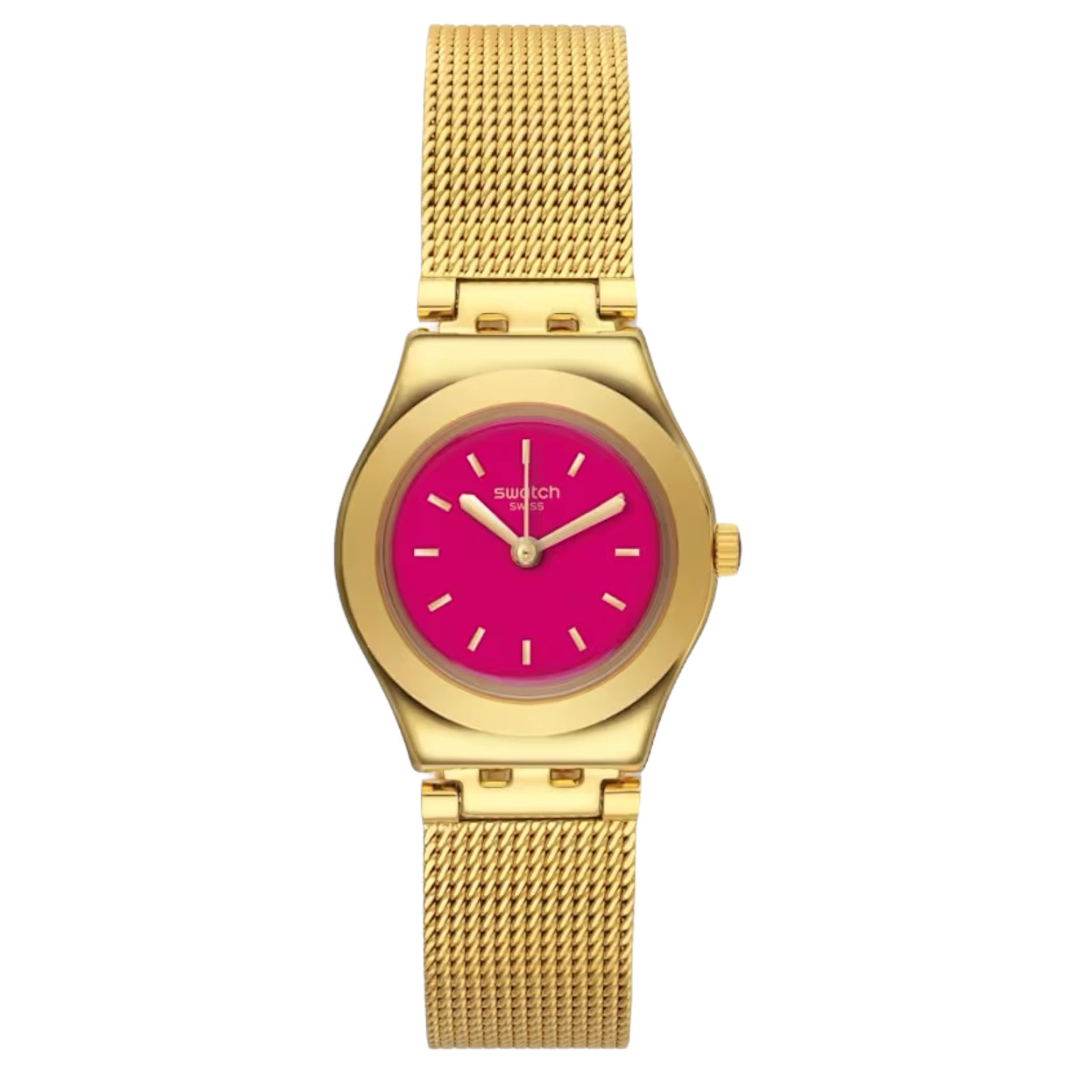 Orologio solo tempo da donna o bambina di Swatch della collezione Irony Mini Twin Pink. Cassa in acciaio dorato lucido del diametro di 25 mm, quadrante fucsia con indici oro, sfere oro, cinturino in acciaio dorato maglia milano, chiusura di sicurezza in acciaio dorato. Resistenza all'acqua 3 bar. Movimento al quarzo Swiss Made.
