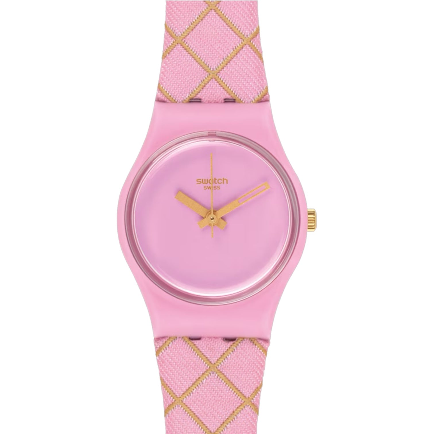 Orologio solo tempo donna o bambina di Swatch della collezione Lady Cinturino Doppio Waffel. Cassa in plastica opaca rosa del diametro di 25 mm, quadrante rosa con sfere dorate, cinturino in pelle doppio rosa, chiusura fibbia in plastica. Resistenza all'acqua 3 atm. Movimento al quarzo Swiss Made.