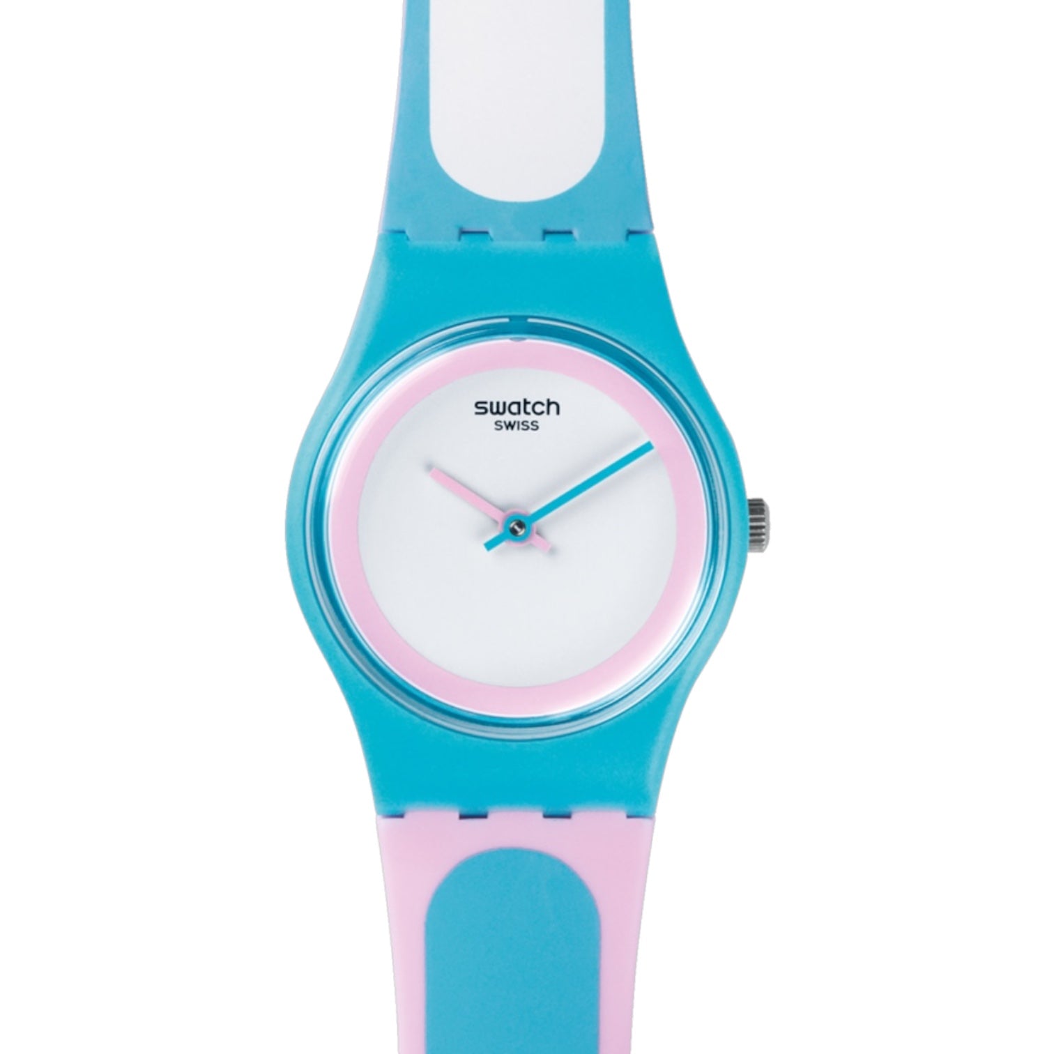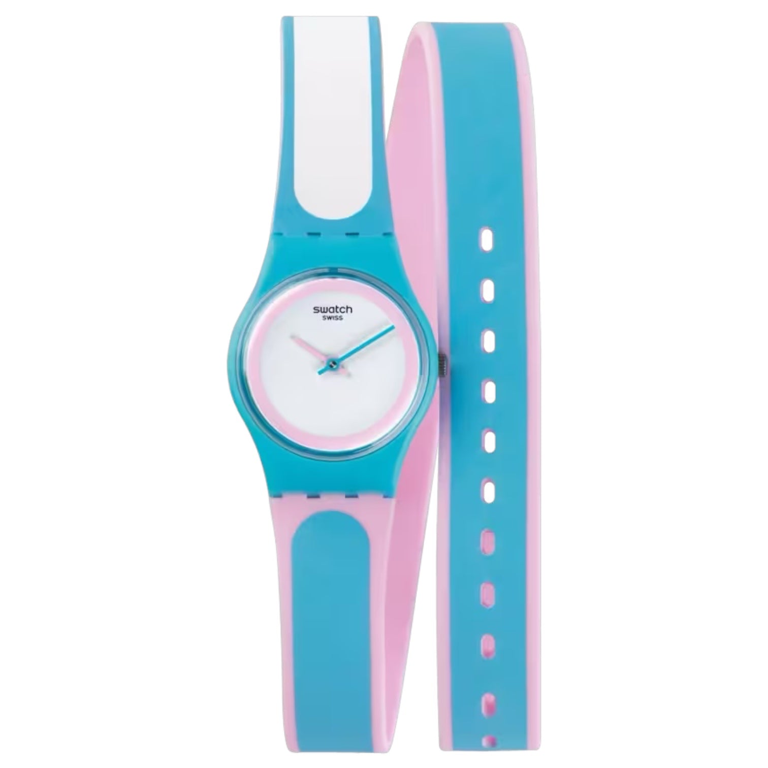 Orologio solo tempo donna o bambina di Swatch della collezione Lady Cinturino Doppio Tropical Beauty. Cassa in plastica opaca azzurra del diametro di 25 mm, quadrante rosa con sfere rosa e azzurre, cinturino in silicone doppio rosa e azzurro, chiusura fibbia in plastica. Resistenza all'acqua 3 atm. Movimento al quarzo Swiss Made.