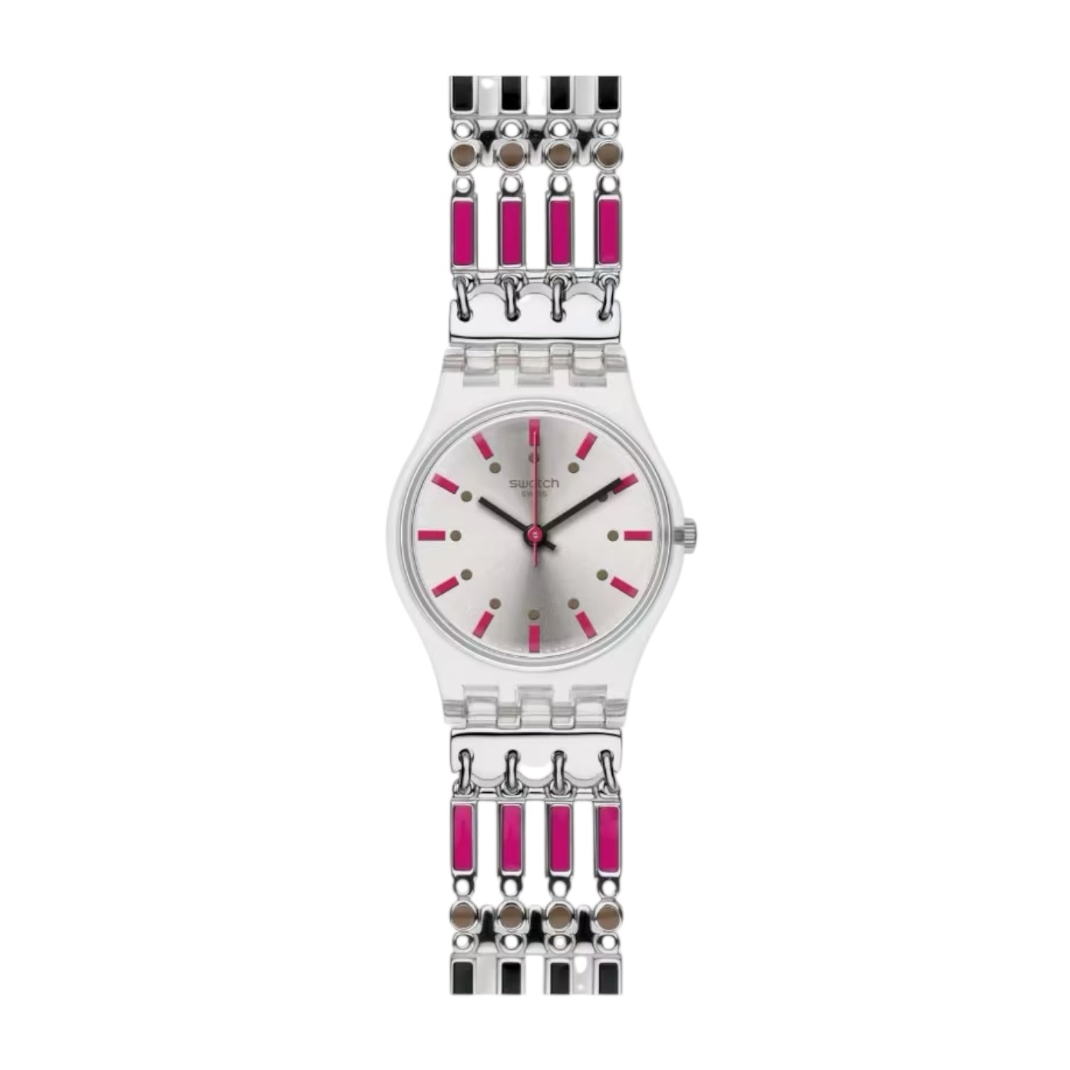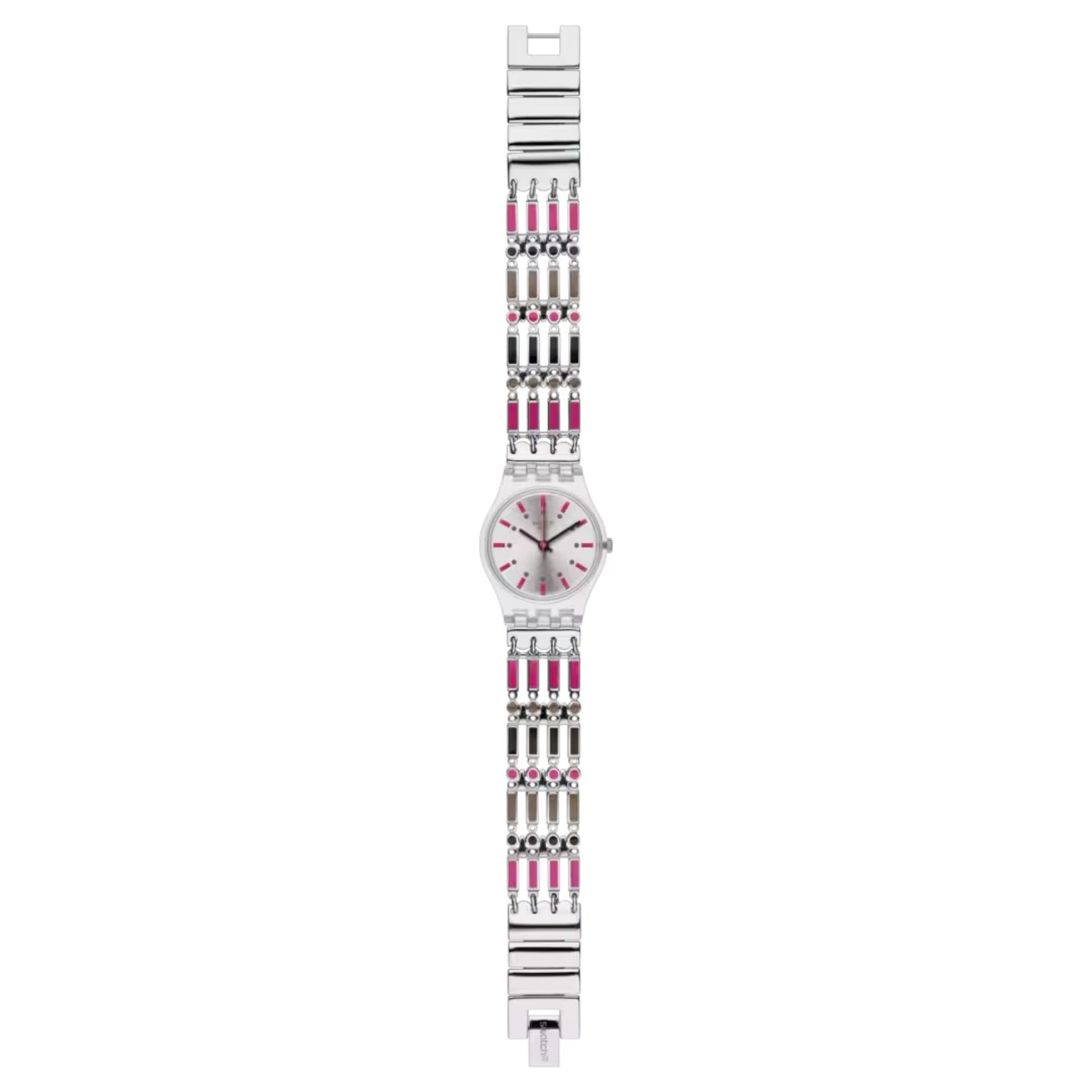 Orologio solo tempo donna o bambina di Swatch della collezione Lady Yhosa. Cassa in plastica lucida trasparente del diametro di 25 mm, quadrante silver con indici fucsia, sfere nere, cinturino in acciaio a barrette smaltate, chiusura di sicurezza. Resistenza all'acqua 3 atm. Movimento al quarzo Swiss Made.