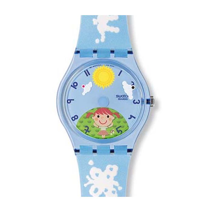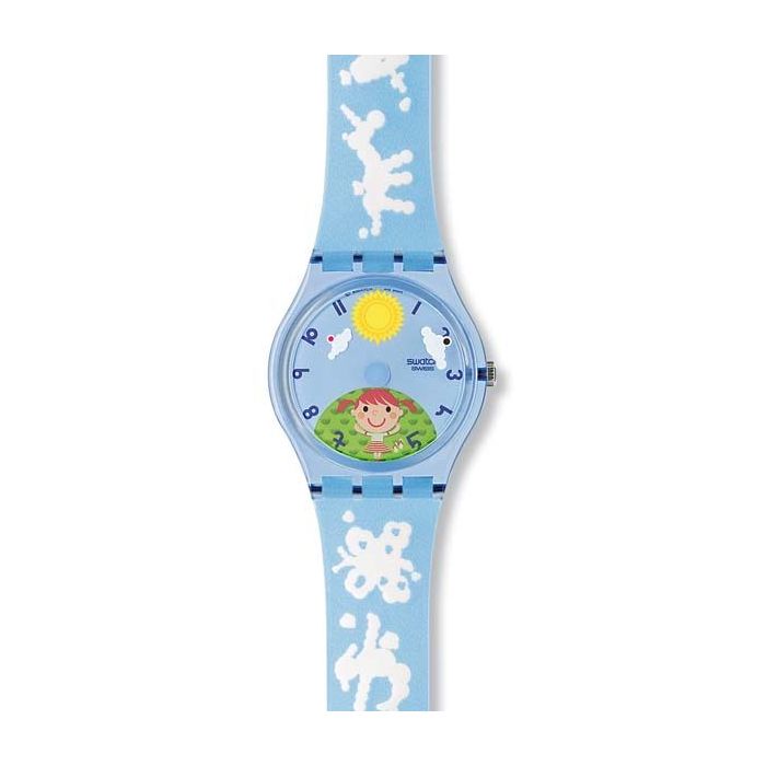 Rarissimo orologio da bimba Swatch realizzato con cinturino in silicone di colore azzurro con disegni di nuvolette bianche, cassa rotonda da 32 mm di diametro in resina trasparente, quadrante che raffigura una bimba e al posto delle lancette ci sono nuvole che girano e indicano l'orario.