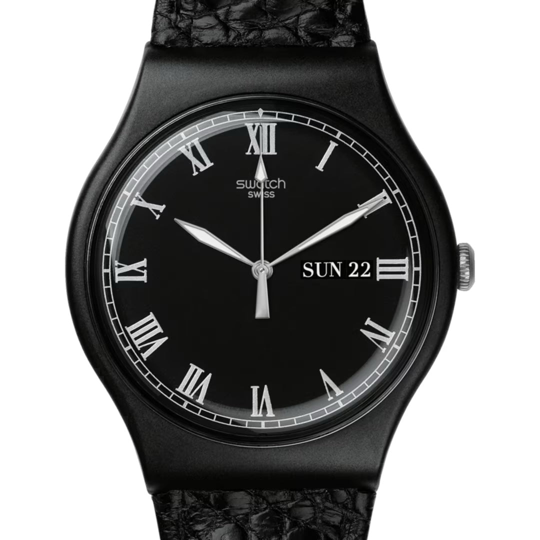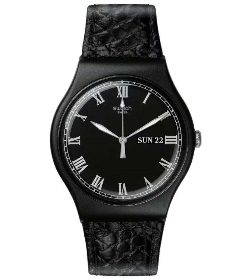 Orologio solo tempo unisex di Swatch Classiko. Cassa in plastica opaca nera del diametro di 41 mm, quadrante quadrante nero con numeri romani bianchi, sfere silver, giorno e data, cinturino pelle stampa cocco nera, chiusura fibbia in plastica. Resistenza all'acqua 3 atm. Movimento al quarzo Swiss Made.