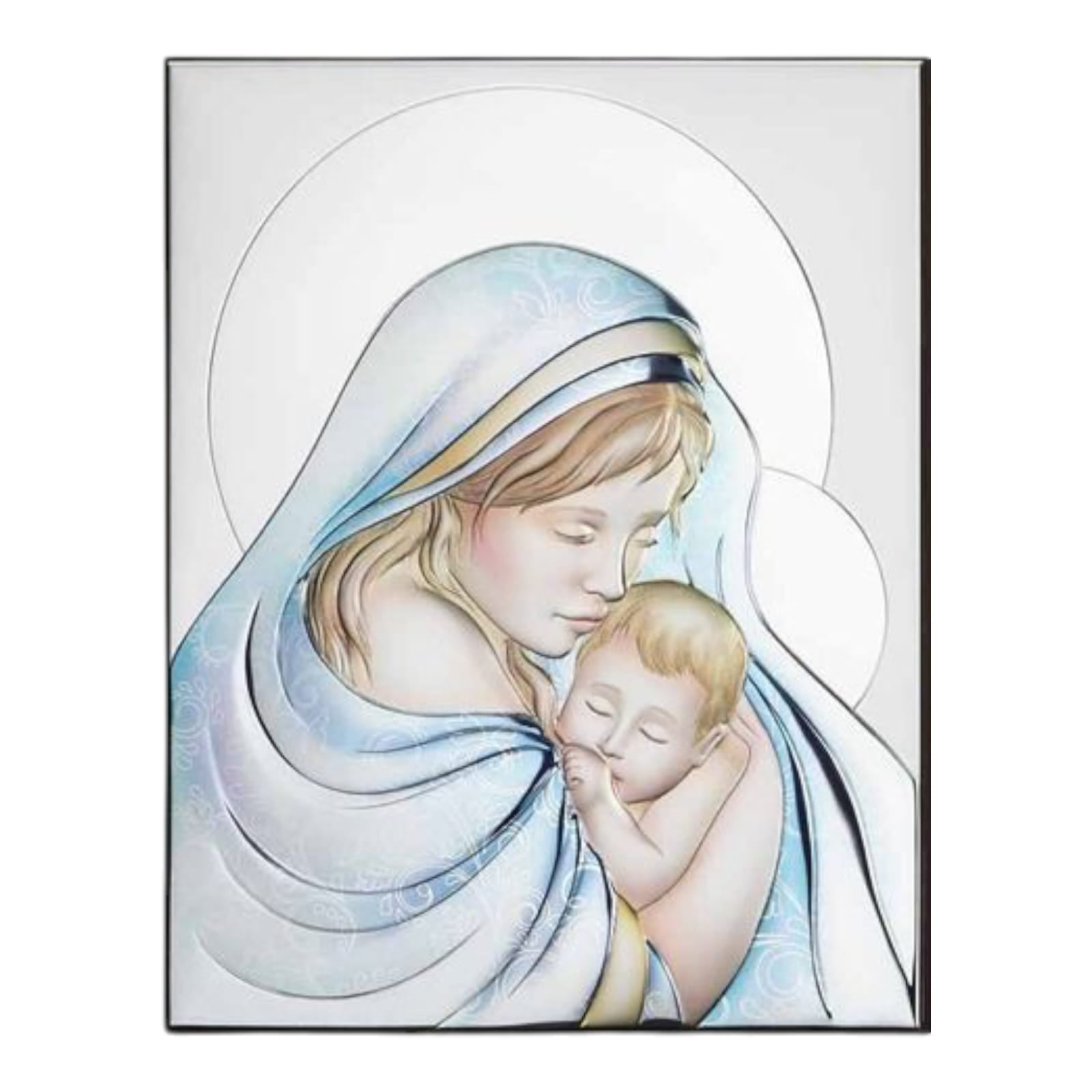 Quadro realizzato in legno ricoperto con una piastra in argento dipinto e lavorata in rilievo. L'articolo misura 22 x 27,5 cm, può essere appeso a muro oppure appoggiato sulla staffa presente sul retro.