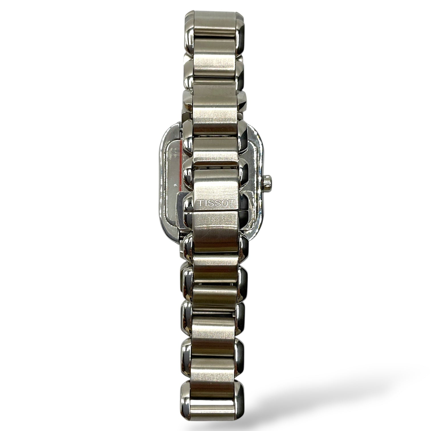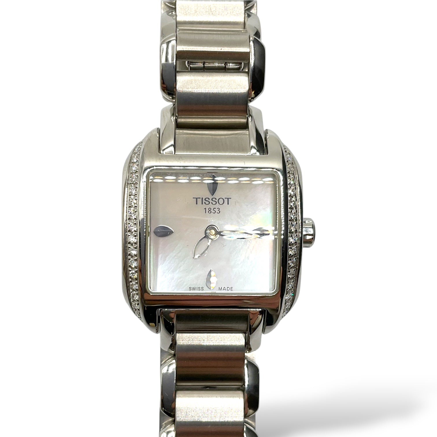 Orologio rettangolare solo tempo da donna di Tissot della collezione Wave. Cassa rettangolare in acciaio lucido delle dimensioni di 23 x 30 mm, diamanti incastonati sui lati della cassa, quadrante madreperla con indici silver, vetro zaffiro. Cinturino in acciaio lucido e satinato, chiusura deployante con pulsanti. Movimento solo tempo al quarzo Swiss Made.