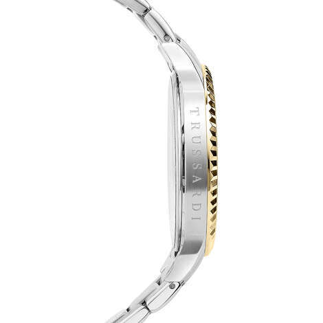 Orologio solo tempo da uomo della collezione T - Bent di Trussardi realizzato con cinturino in acciaio inox bicolore silver e gold e chiusura a deployante con pulsanti. Cassa rotonda da 43 mm di diametro con incisione laterale, ghiera zigrinata in acciaio dorato, quadrante satinato di colore blu scuro con elementi in acciaio dorato e datario alle ore 6. Resistenza all'acqua fino a 5 ATM