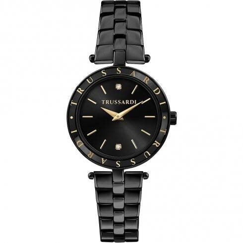 Orologio da donna della collezione T Shiny realizzato con cinturino in acciaio nero, chiusura a deployante con pulsanti. Cassa rotonda da 34 mm, ghiera con logo Trussardi, quadrante nero con lancette e indici in acciaio dorato impreziosito con uno zircone bianco.
