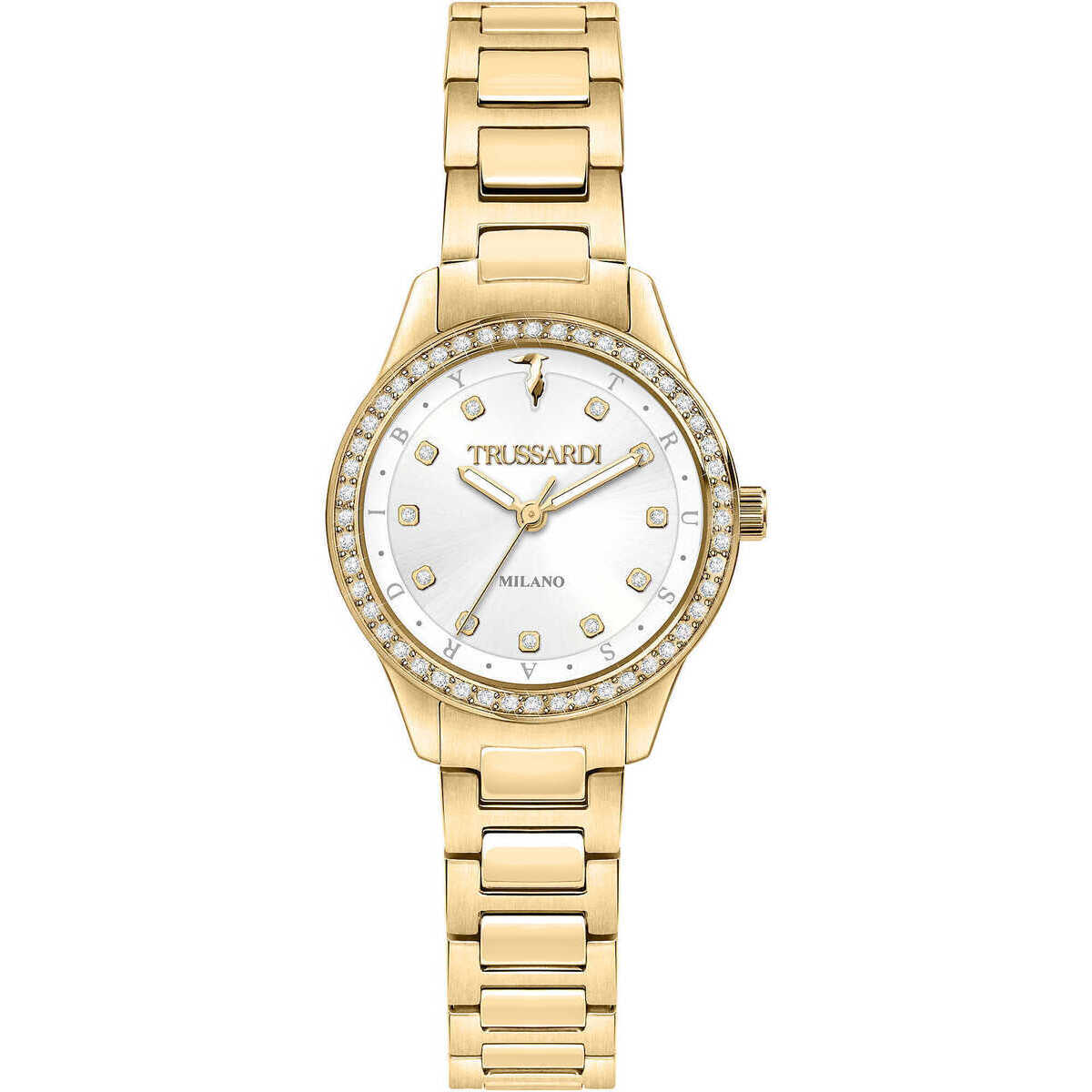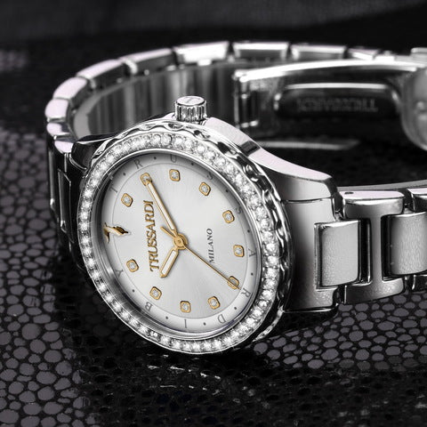 Orologio da donna della collezione T - Sky di Trussardi realizzato con cinturino in acciaio lucido, chiusura a fibbia deployante con pulsanti. Cassa rotonda da 30 mm con zirconi bianchi, quadrante bianco con lancette in acciaio inox dalla finitura dorata e zirconi come indici. Movimento solo tempo al quarzo, resistenza all'acqua fino a 5 ATM.