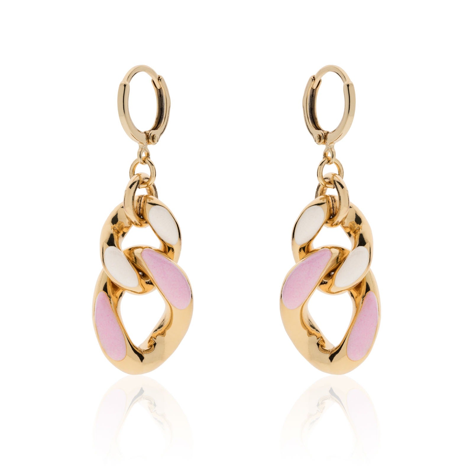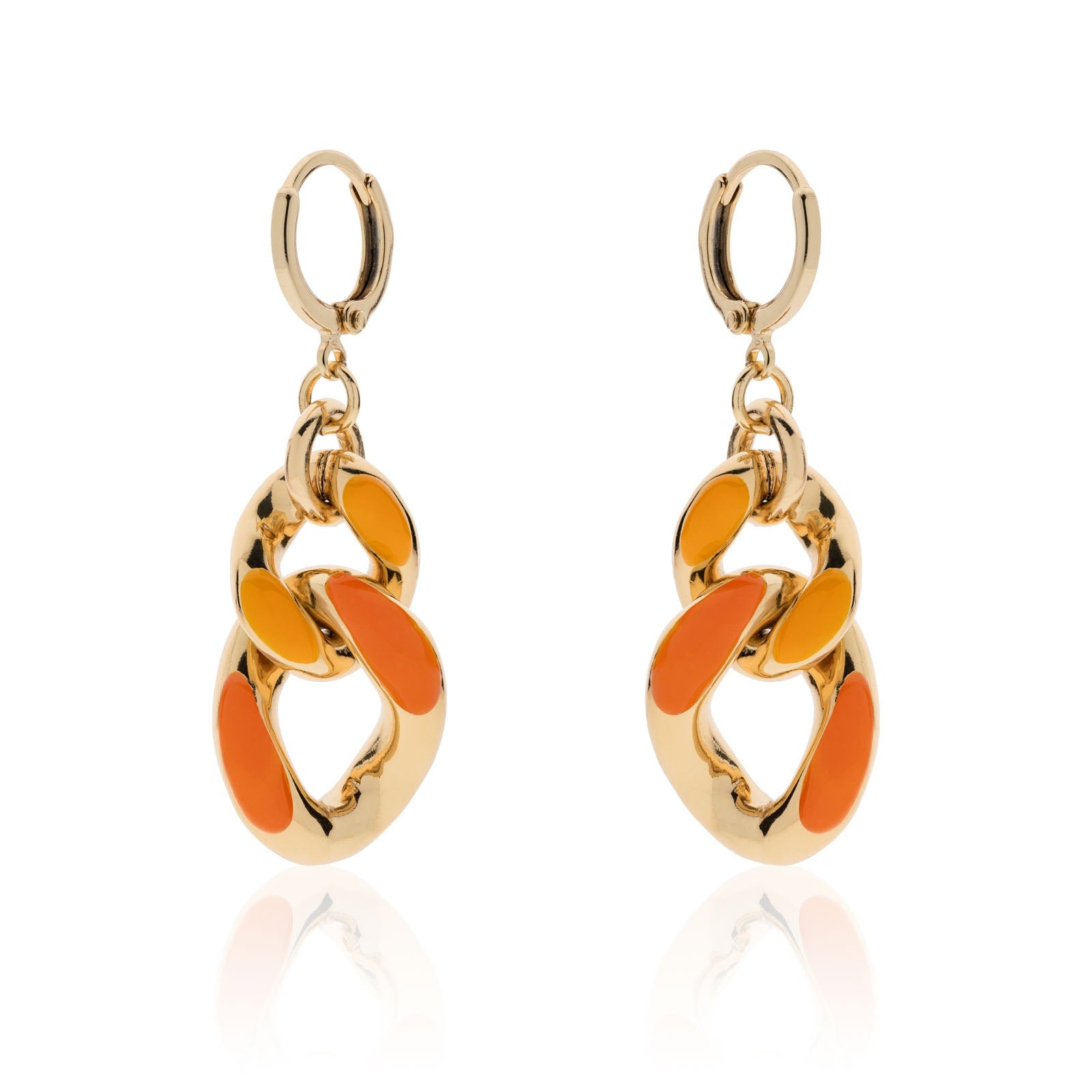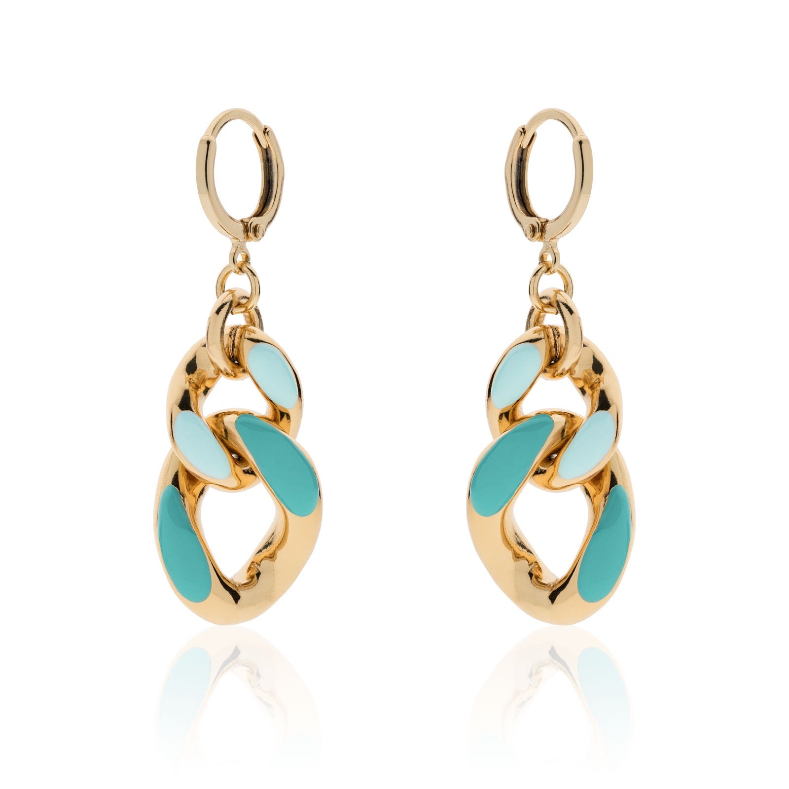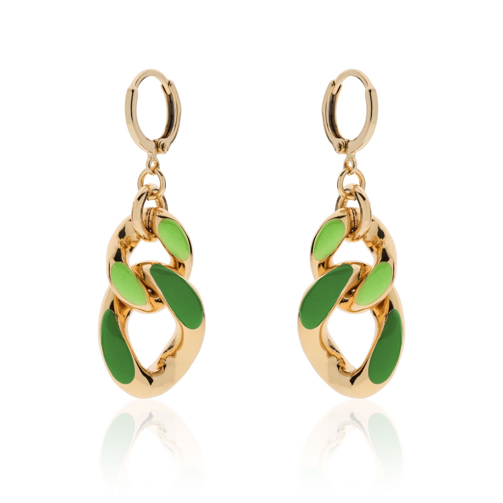 Orecchini in bronzo dorato con catena grumetta e smalto verde, arancione, azzurro, fucsia e rosa. Dal design fluido ed elegante al vivace tocco di colore, questi orecchini sono il compagno perfetto 24 ore su 24, 7 giorni su 7. Abbina i tuoi outfit ai nostri orecchini groumette e ai gioielli coordinati. Gioca con il colore e le forme per stravolgere i tuoi look in un semplice gesto.