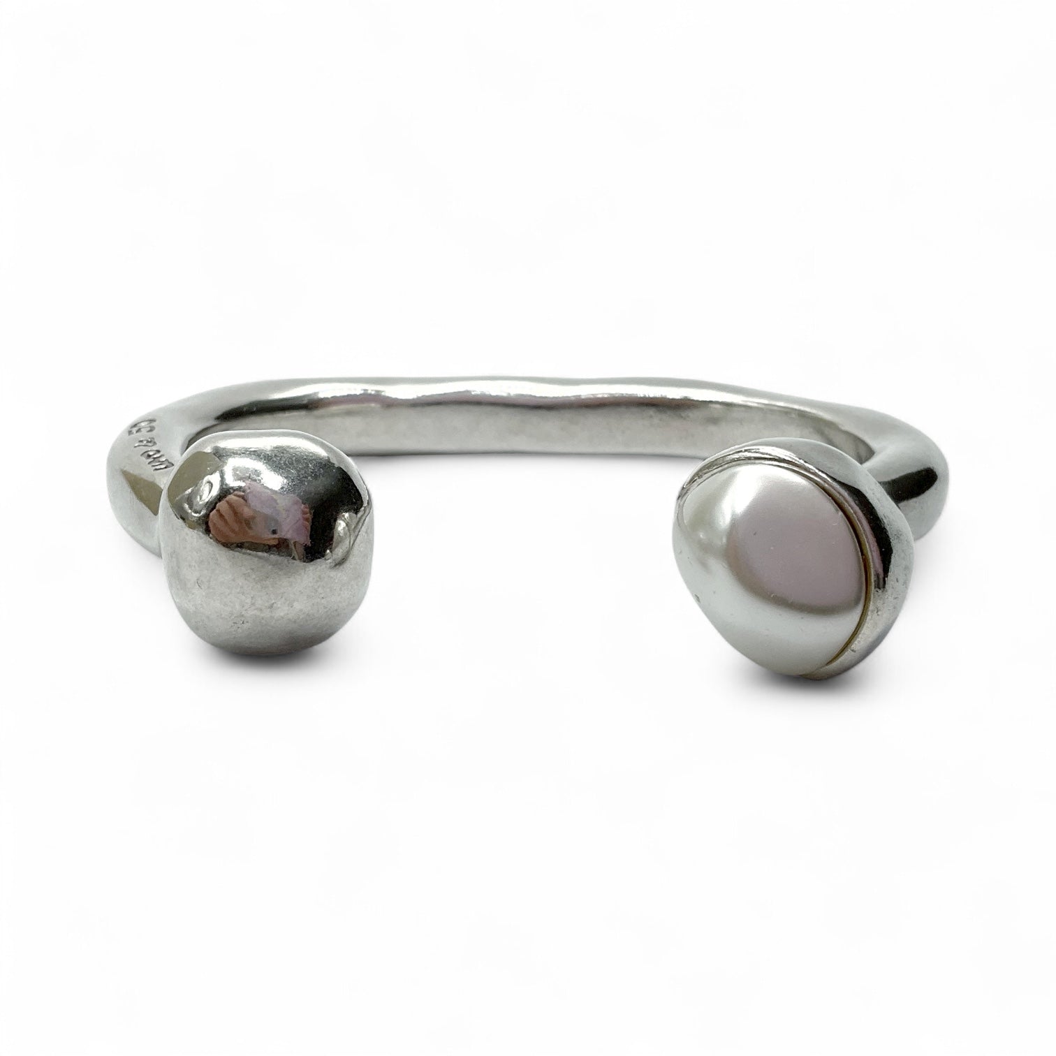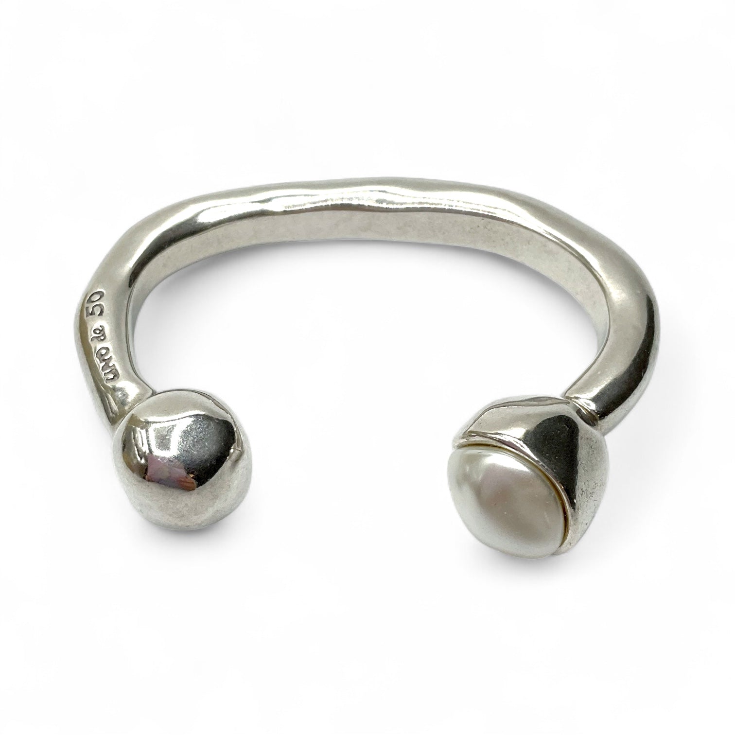 Bracciale rigido da donna di Unode50. Bracciale rigido in lega di metallo placato argento con pallina finale di cui una intercambiabile, disponibile in metallo martellato o con perla riprodotta. Realizzato artigianalmente in Spagna.