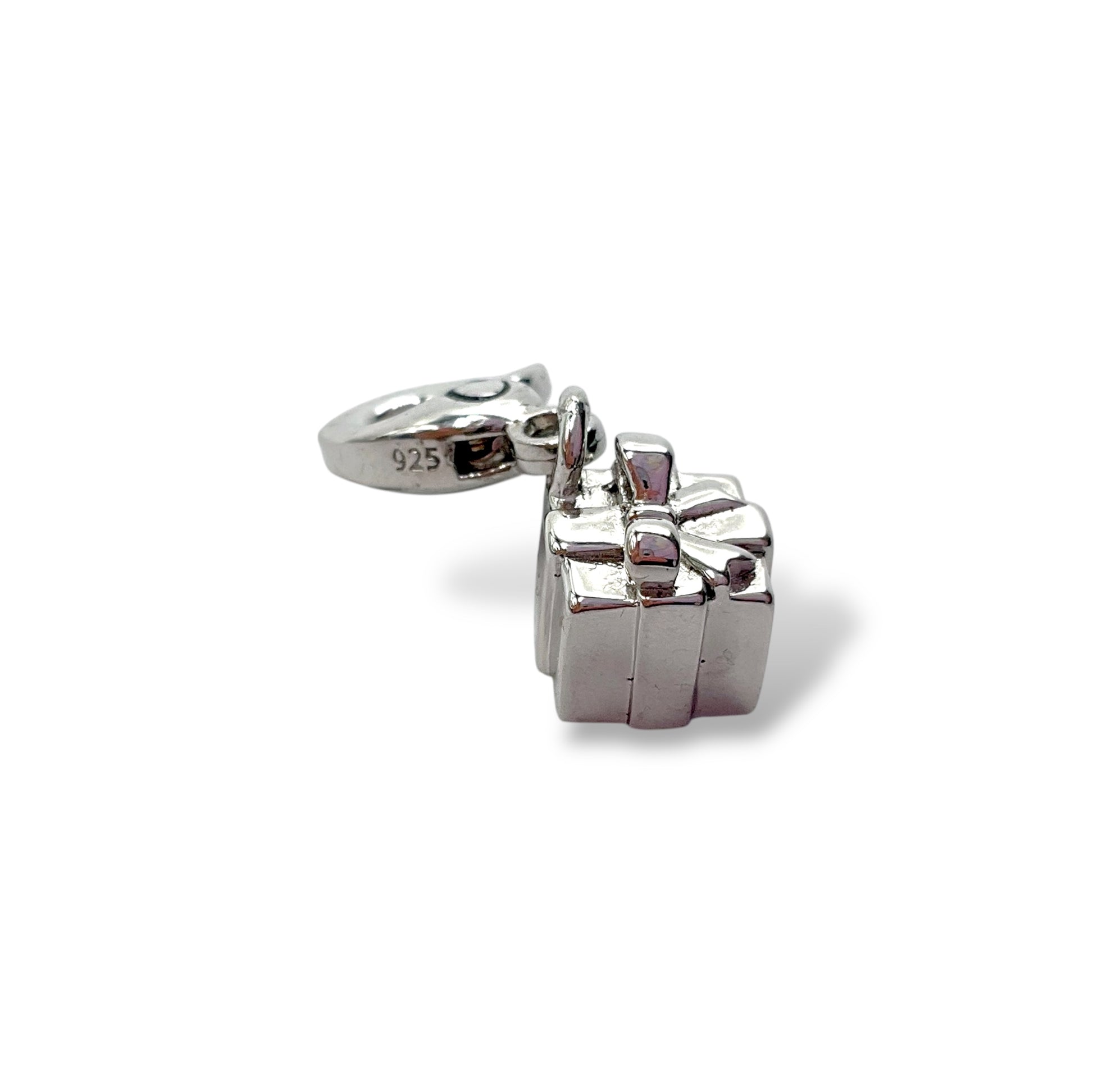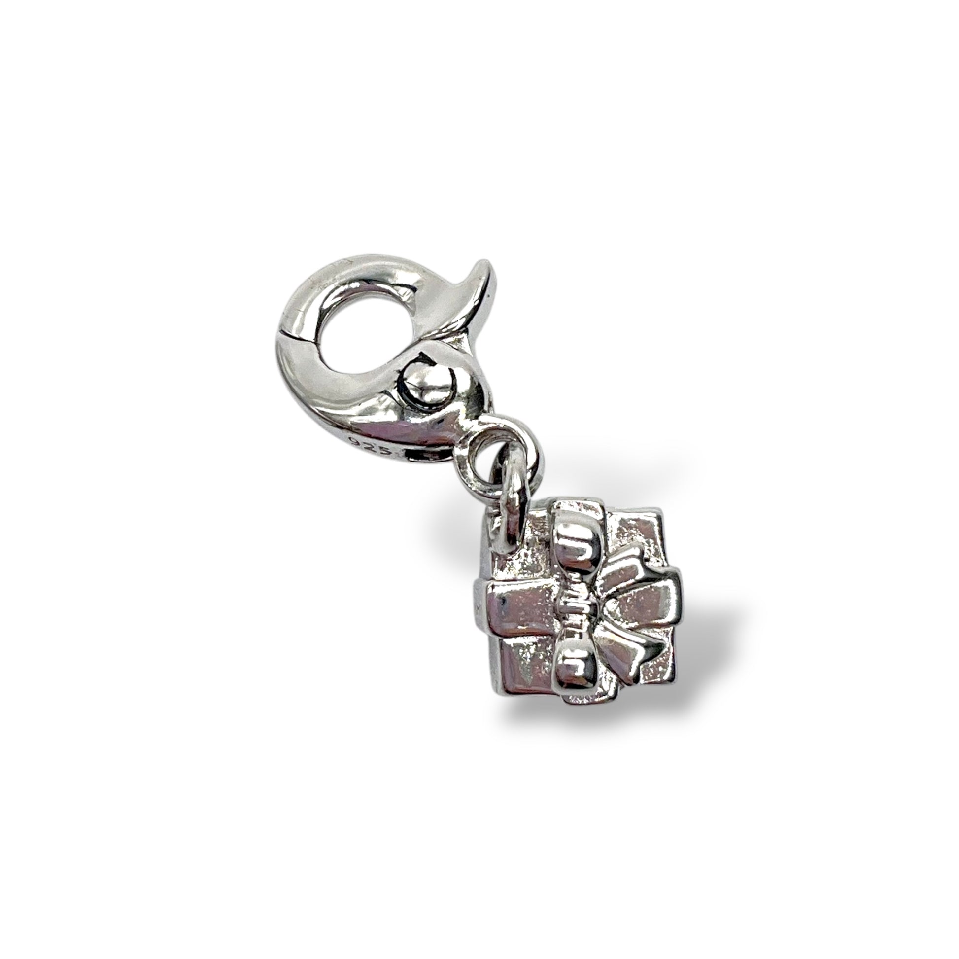 Ciondolo della collezione Charming by Ti sento in argento a forma di pacco regalo. Questo ciondolo ha un comodo moschettone per poterlo inserire in bracciali o collane.