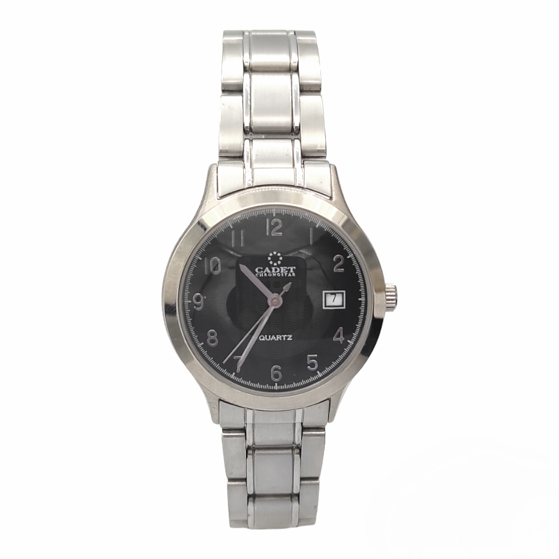 Orologio da donna del brand Cadet realizzato con cinturino in acciaio inox dalla finitura lucida e chiusura a deployante. Cassa rotonda da 29 mm di diametro con quadrante di colore nero con lancette e numeri in acciaio inox lucido, datario alle ore 3. Movimento solo tempo al quarzo,