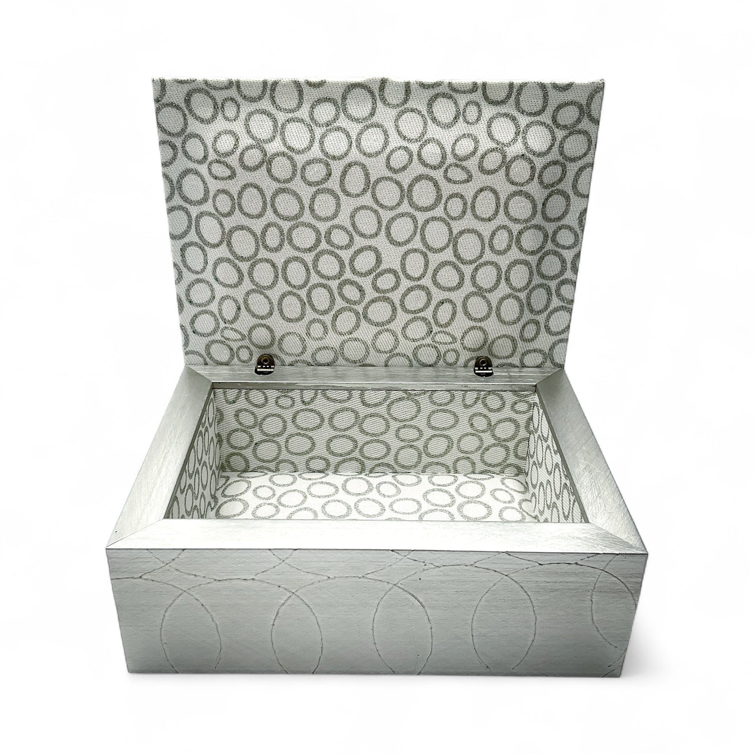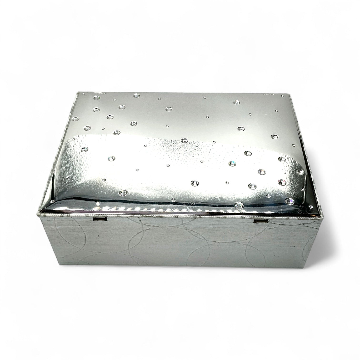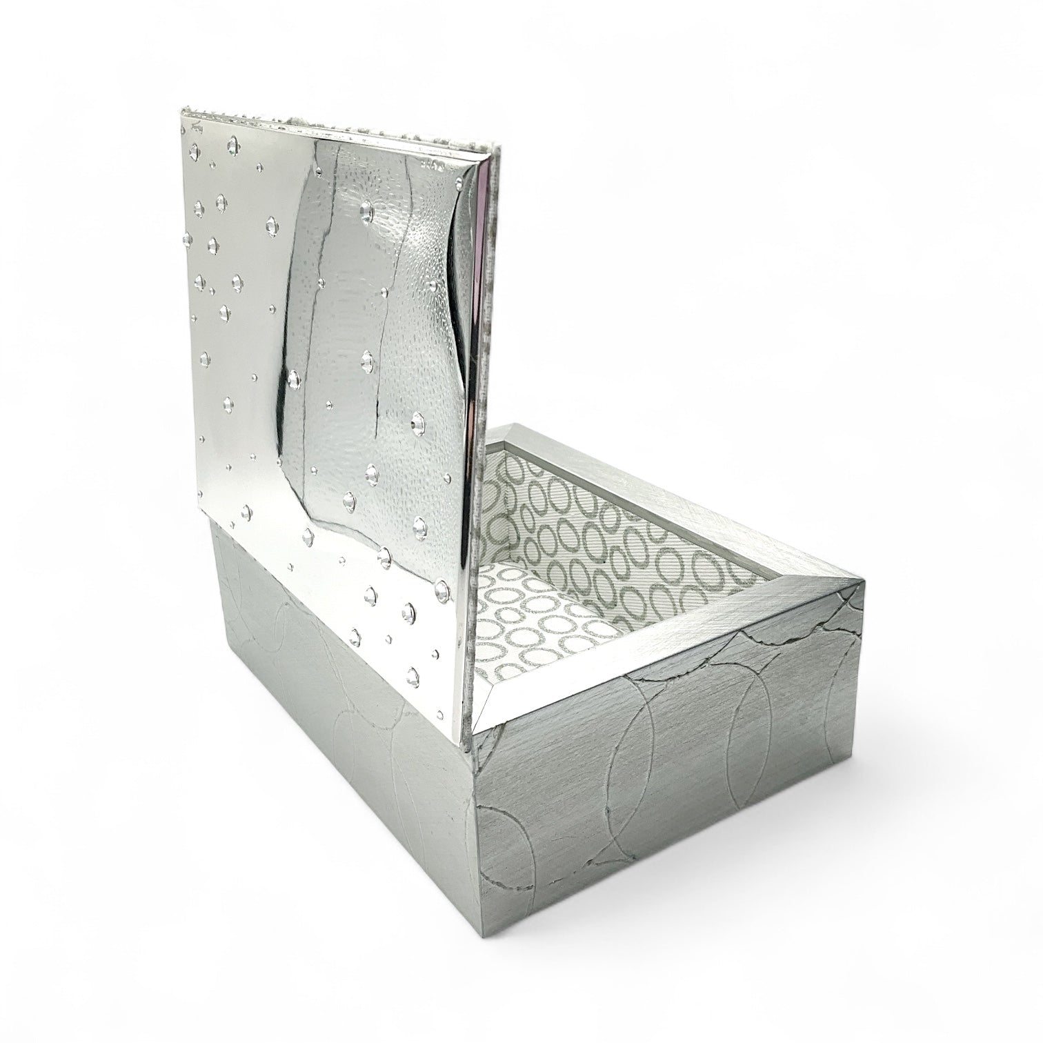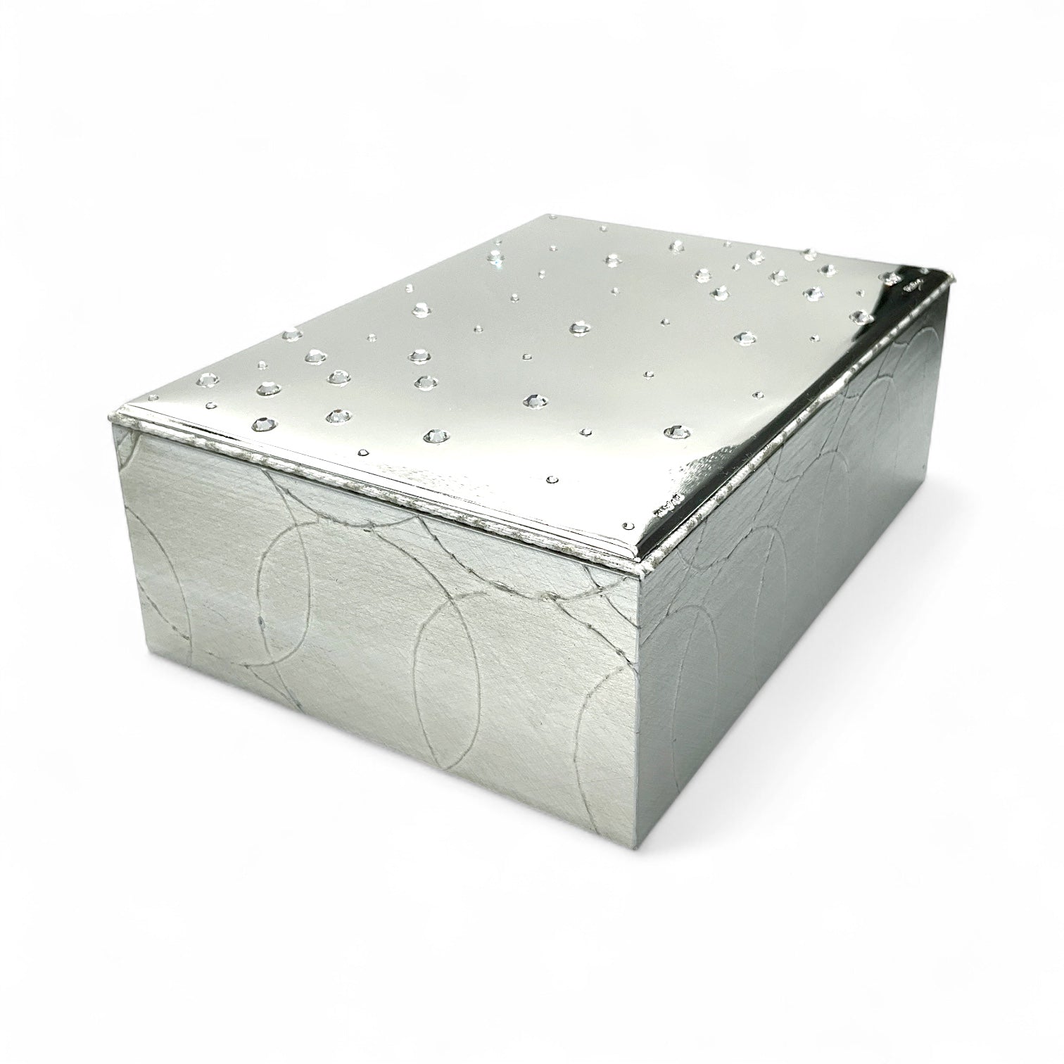 Scrigno portagioie in argento di Ottaviani della collezione Notte di San Lorenzo. Scrigno realizzato con lastra argento e cristalli Swarovski applicati, legno decorato di colore argento, interno in stoffa decorata.