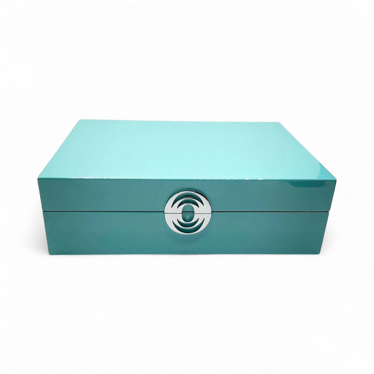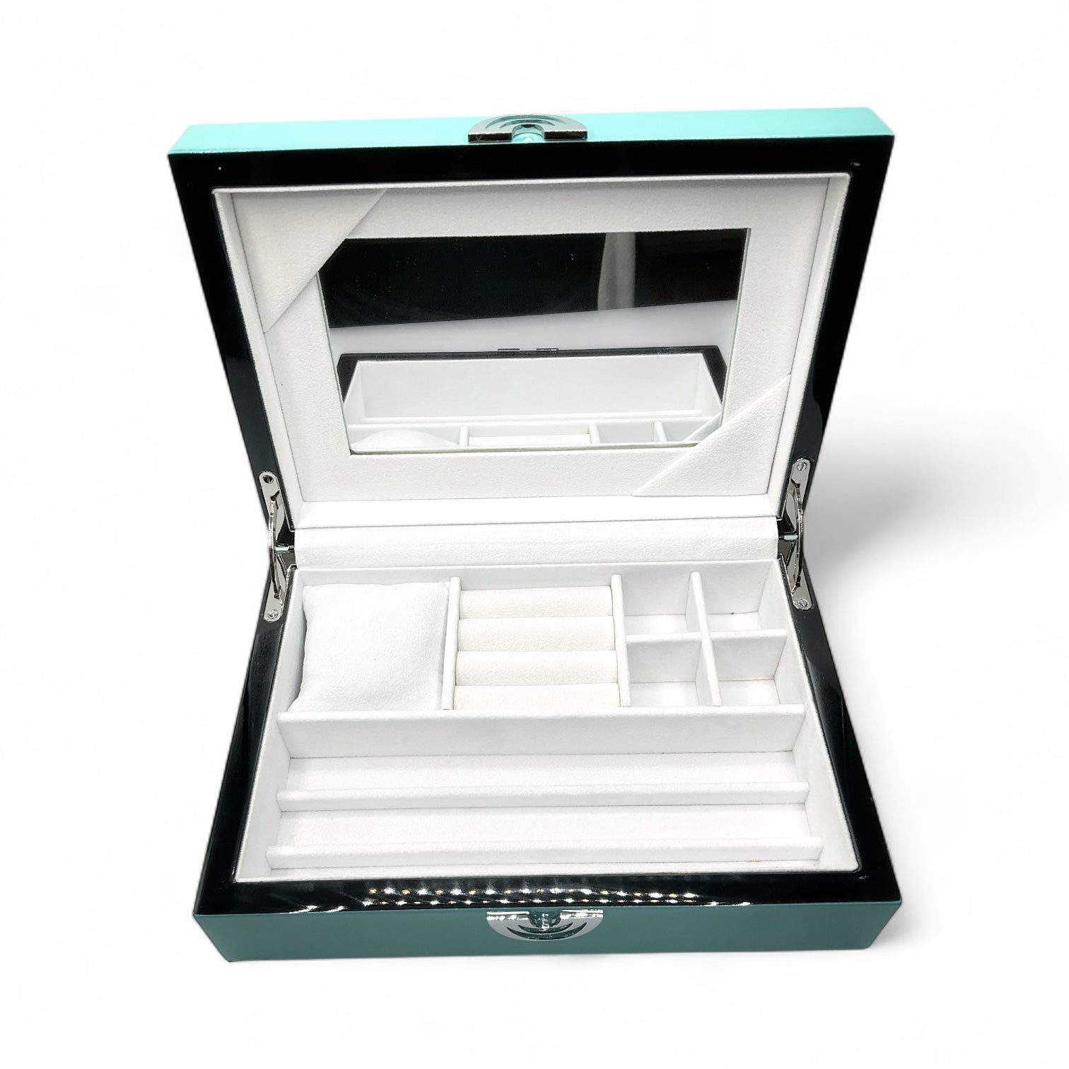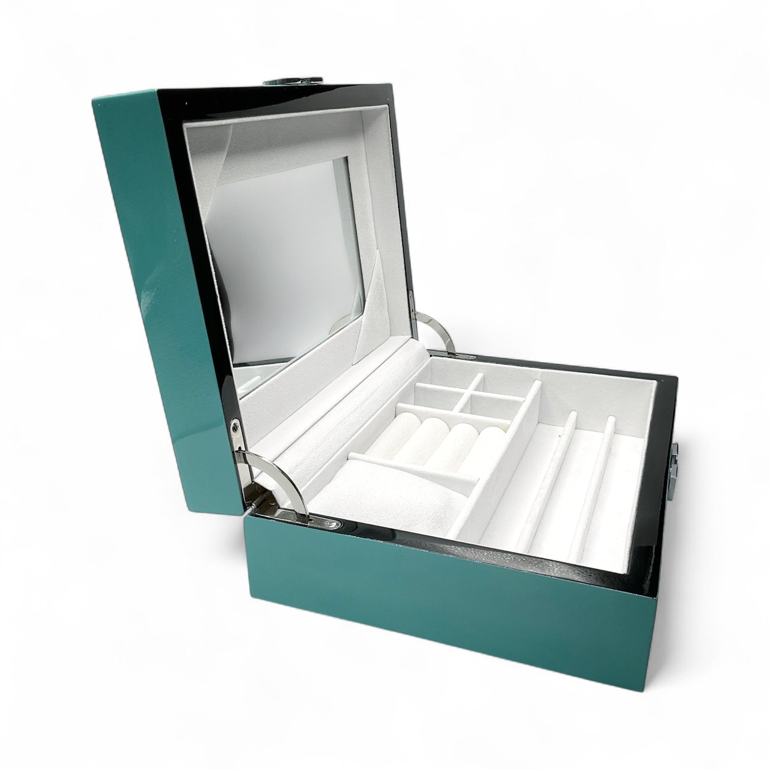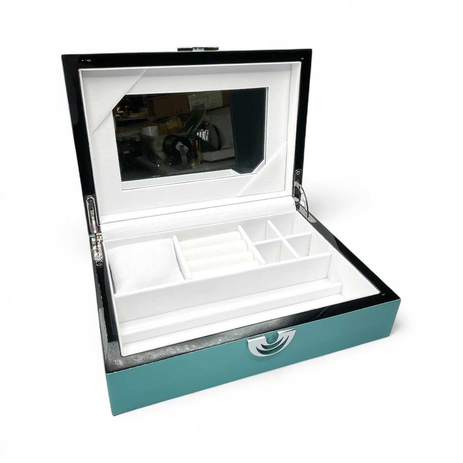 Scrigno portagioie di Ottaviani. Scrigno realizzato in legno laccato colore Verde acqua con all'interno specchio e portagioie di velluto bianco.